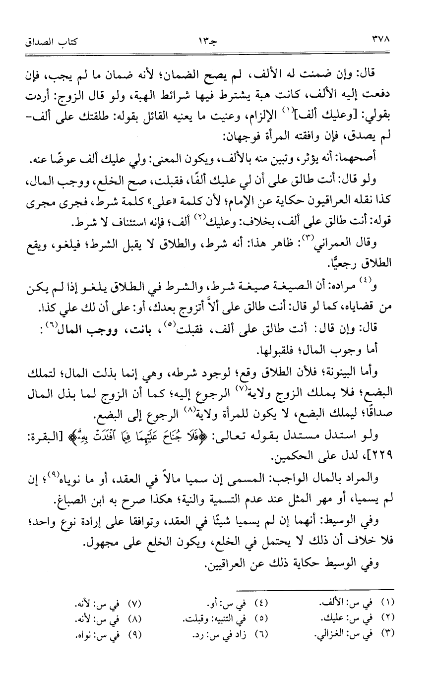 ولو قال: أنت طالق على أن لي عليك ألفاً، فقبلت، صح الخلع، ووجب المال، كذا نقله العراقيون حكاية عن الإمام؛ لأن كلمة "على" كلمة شرط، فجرى مجرى قوله: أنت طالق على ألف، بخلاف: وعليك ألف؛ فإنه استئناف لا شرط.
