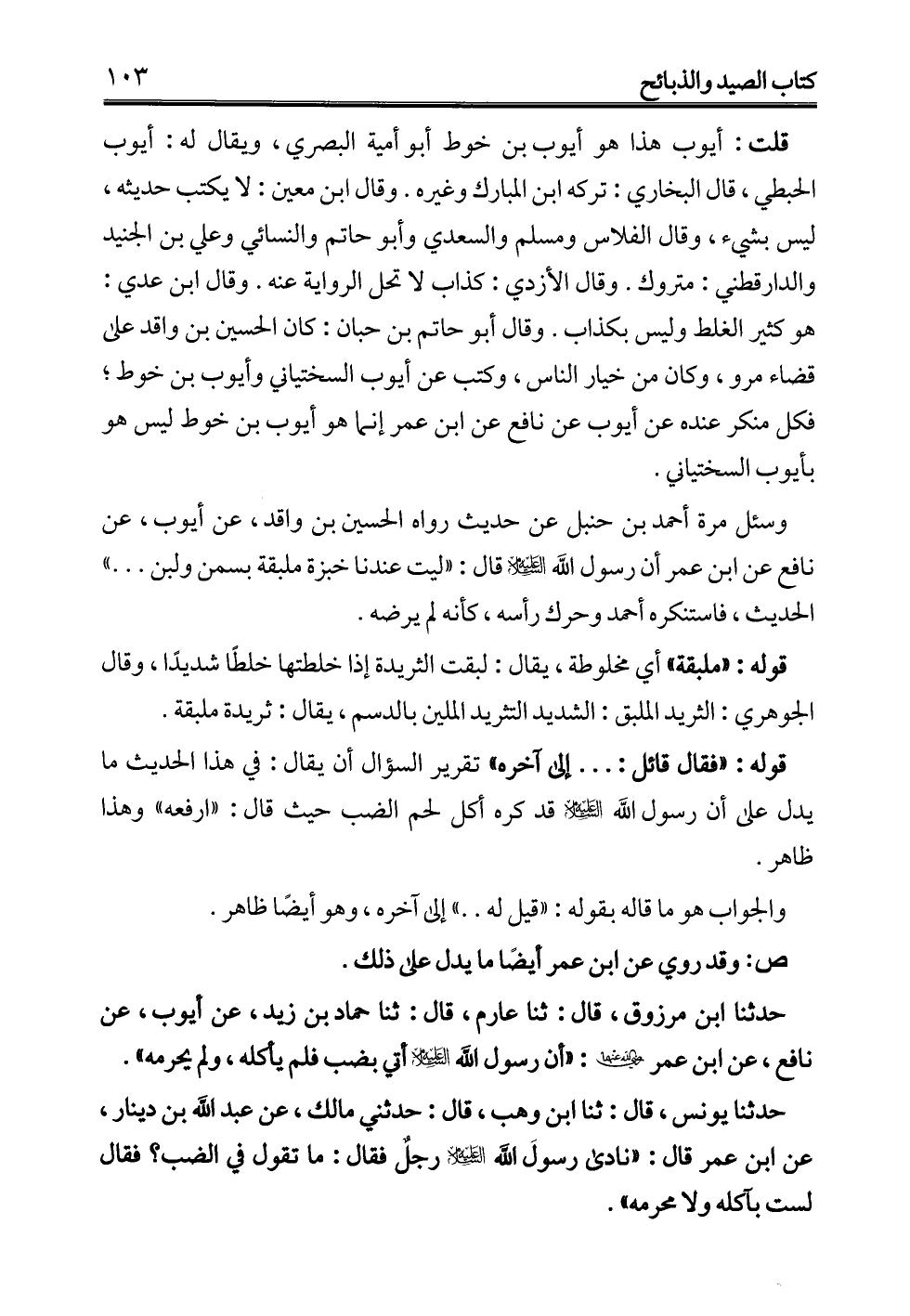 حدثنا ابن مرزوق، قال: ثنا عارم، قال: ثنا حماد بن زيد، عن أيوب، عن نافع، عن ابن عمر -رضي الله عنهما-: "أن رسول الله -عليه السلام- أتي بضب فلم يأكله، ولم يحرمه".