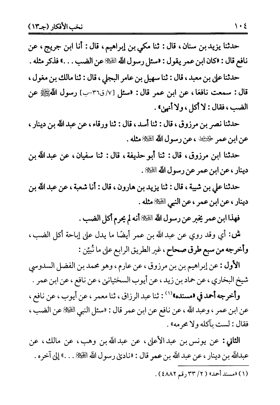 حدثنا علي بن معبد، قال: ثنا سهيل بن عامر البجلي، قال: ثنا مالك بن مغول، قال: سمعت نافعًا، عن ابن عمر قال: "سئل رسول الله - صلى الله عليه وسلم - عن الضب، فقال: لا أكل، ولا أنهى".
