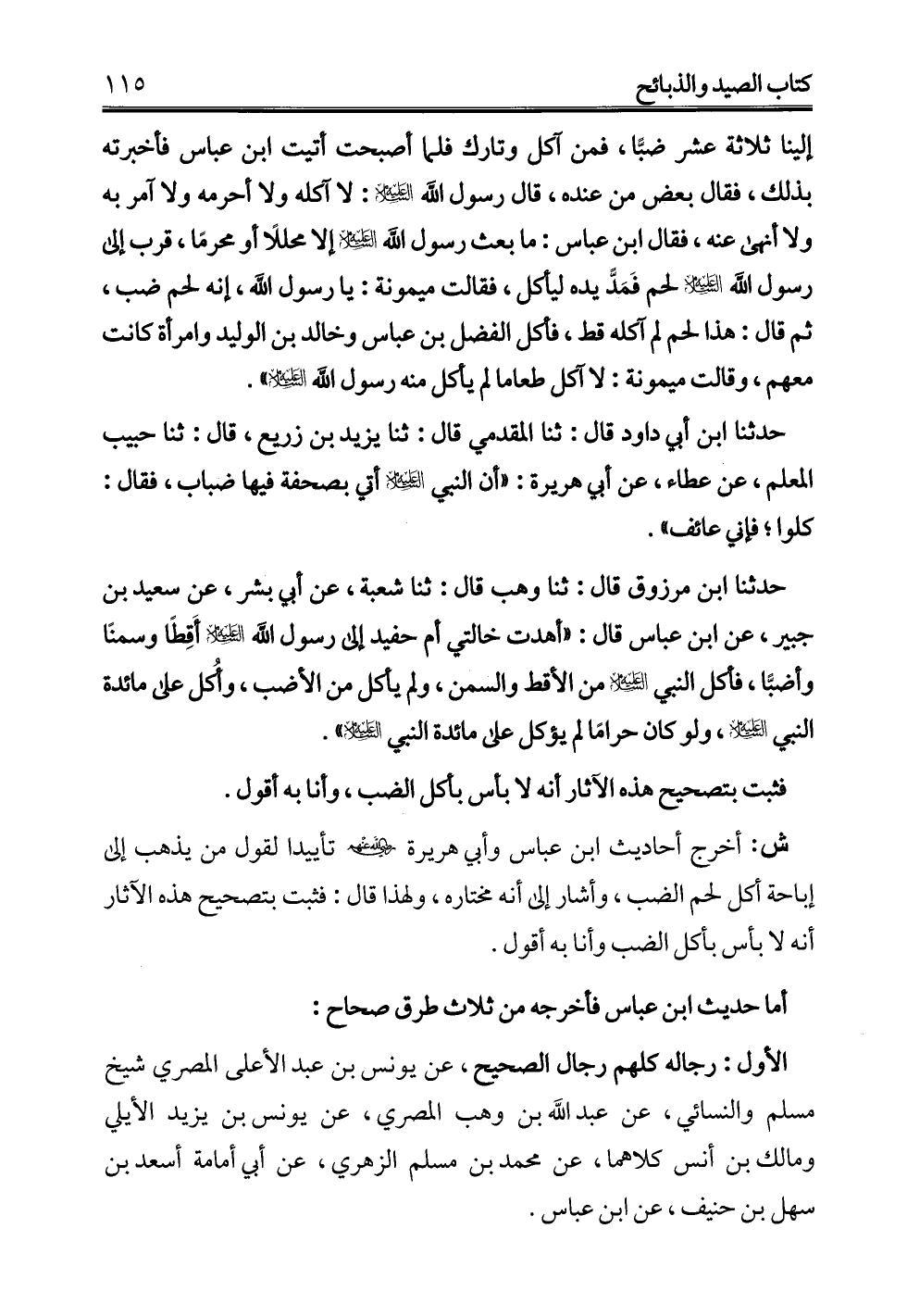 حدثنا ابن مرزوق قال: ثنا وهب قال: ثنا شعبة، عن أبي بشر، عن سعيد بن جبير، عن ابن عباس قال: "أهدت خالتي أم حفيد إلى رسول الله -عليه السلام- أَقِطًا وسمنًا وأضبًّا، فأكل النبي -عليه السلام- من الأقط والسمن، ولم يأكل من الأضب، وأكُل على مائدة النبي -عليه السلام- ولو كان حرامًا لم يؤكل على مائدة النبي -عليه السلام-".