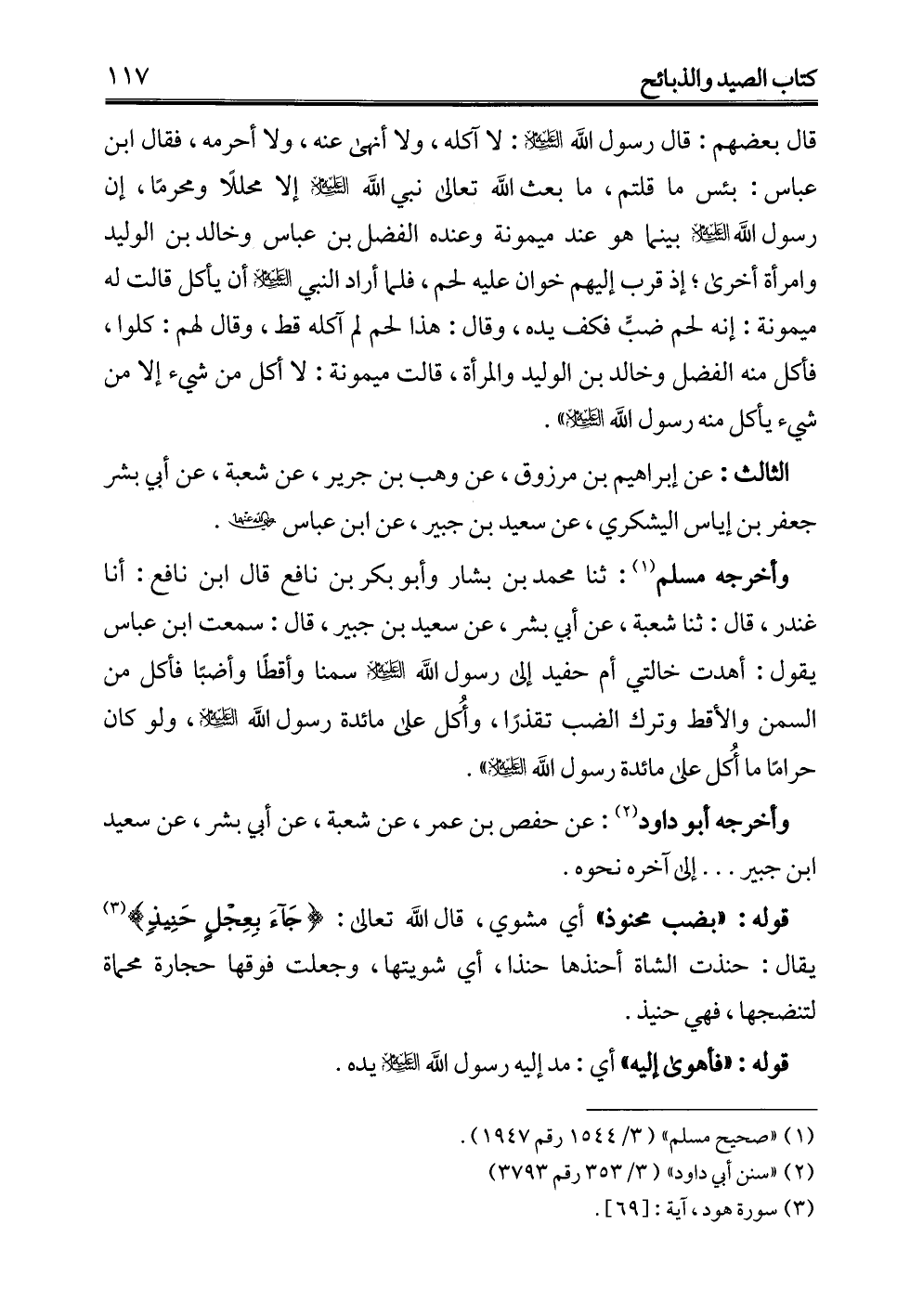 وأخرجه مسلم (¬1): ثنا محمد بن بشار وأبو بكر بن نافع قال ابن نافع: أنا غندر، قال: ثنا شعبة، عن أبي بشر، عن سعيد بن جبير، قال: سمعت ابن عباس يقول: أهدت خالتي أم حفيد إلى رسول الله -عليه السلام- سمنا وأقطًا وأضبًا فأكل من السمن والأقط وترك الضب تقذرًا، وأُكل على مائدة رسول الله -عليه السلام-, ولو كان حرامًا ما أُكل على مائدة رسول الله -عليه السلام-".