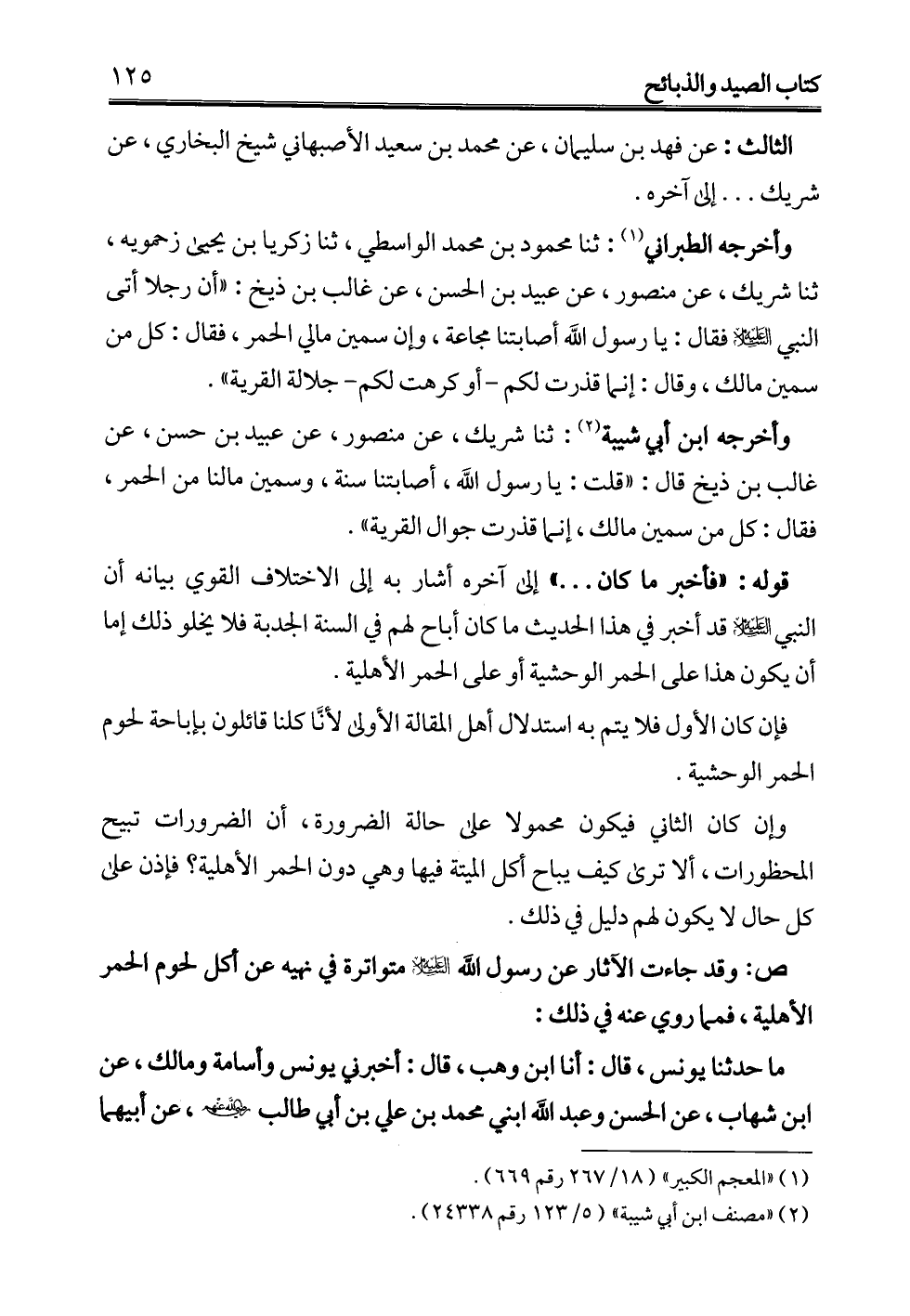 وأخرجه ابن أبي شيبه (¬2): ثنا شريك، عن منصور، عن عبيد بن حسن، عن غالب بن ذيخ قال: "قلت: يا رسول الله، أصابتنا سنة، وسمين مالنا من الحمر، فقال: كل من سمين مالك، إنما قذرت جوال القرية".