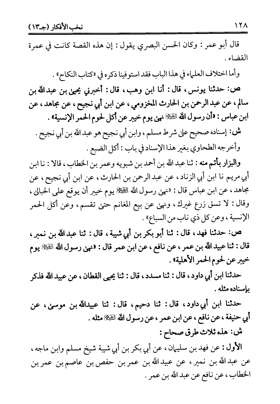 ص: حدثنا فهد، قال: ثنا أبو بكر بن أبي شيبة، قال: ثنا عبد الله بن نمبر، قال: ثنا عبيد الله بن عمر، عن نافع، عن ابن عمر قال: "نهى رسول الله -عليه السلام- يوم خيبر عن لحوم الحمر الأهلية".