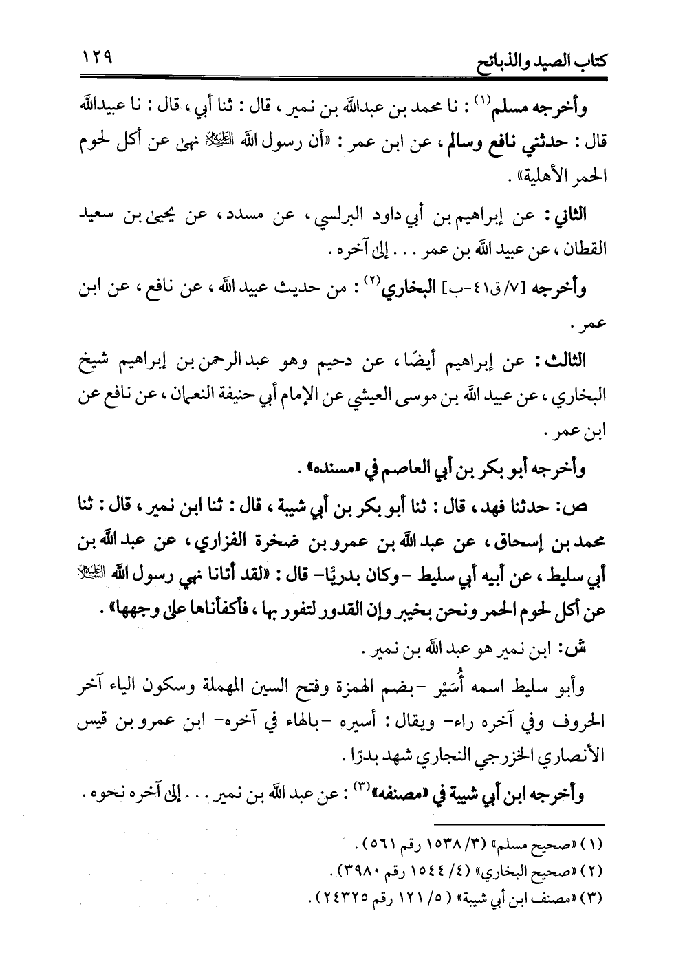 وأخرجه مسلم (¬1): نا محمد بن عبد الله بن نمير، قال: ثنا أبي، قال: نا عبيد الله قال: حدثني نافع وسالم، عن ابن عمر: "أن رسول الله -عليه السلام- نهى عن أكل لحوم الحمر الأهلية".