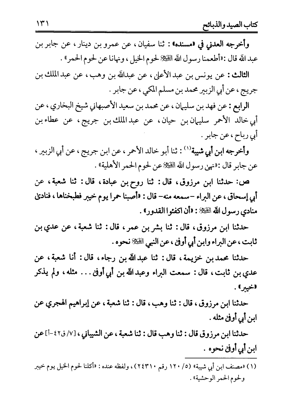 وأخرجه العدني في "مسنده": ثنا سفيان، عن عمرو بن دينار، عن جابر بن عبد الله قال: "أطعمنا رسول الله -عليه السلام- لحوم الخيل، ونهانا عن لحوم الحمر".