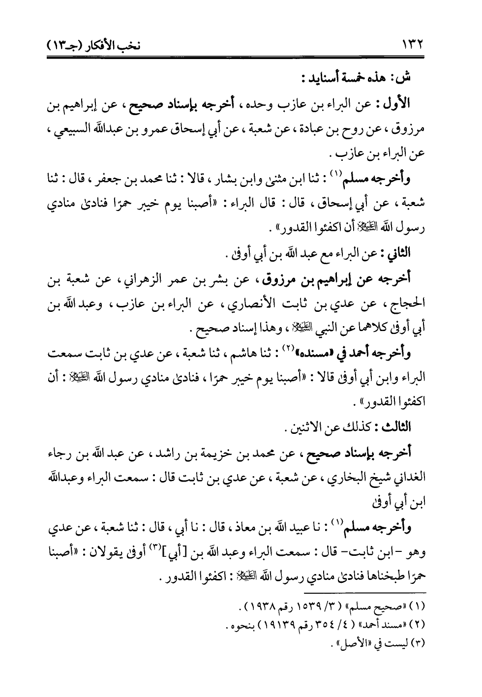 وأخرجه مسلم (1): نا عبيد الله بن معاذ، قال: نا أبي، قال: ثنا شعبة، عن عدي وهو -ابن ثابت- قال: سمعت البراء وعبد الله بن [أبي] (¬3) أوفى يقولان: "أصبنا حمرًا طبخناها فنادى منادي رسول الله -عليه السلام-: اكفئوا القدور.