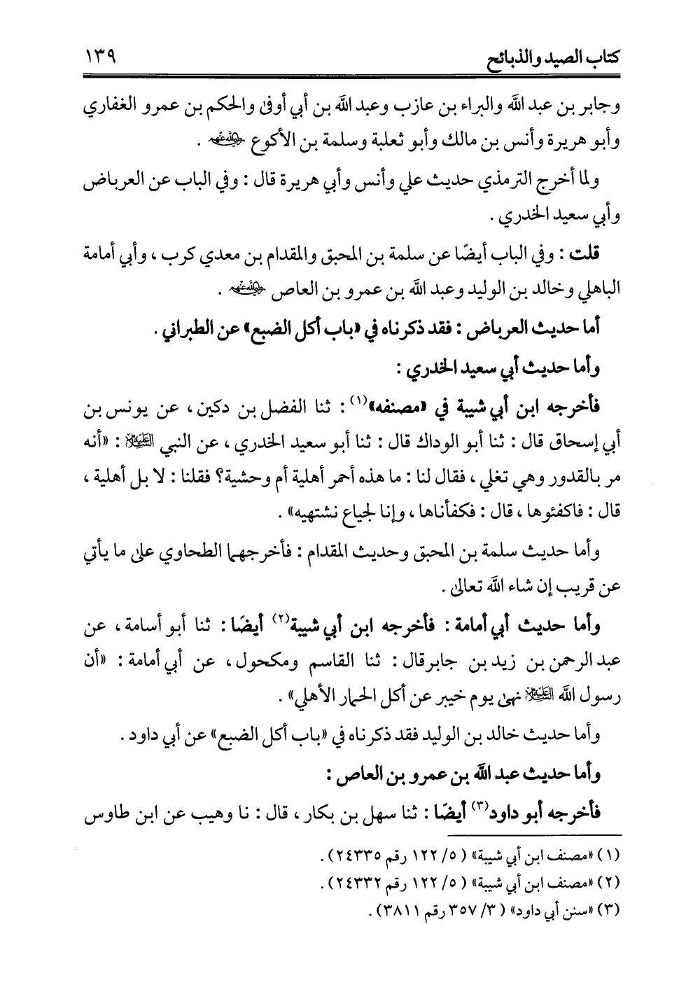 قلت: وفي الباب أيضًا عن سلمة بن المحبق والمقدام بن معدي كرب، وأبي أمامة الباهلي وخالد بن الوليد وعبد الله بن عمرو بن العاص -رضي الله عنهم-.