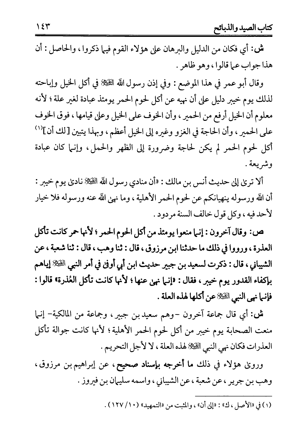 ش: أي قال جماعة آخرون -وهم سعيد بن جبير، وجماعة من المالكية- إنما منعت الصحابة يوم خيبر من أكل لحوم الحمر الأهلية؛ لأنها كانت جوالة تأكل العذرات فكان نهي النبي -عليه السلام- لهذه العلة، لا لأجل التحريم.
