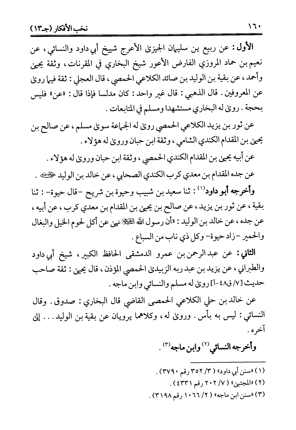 وأخرجه أبو داود (¬1): ثنا سعيد بن شبيب وحيوة بن شريح -قال حيوة-: ثنا بقية، عن ثور بن يزيد، عن صالح بن يحيى بن المقدام بن معدي كرب، عن أبيه، عن جده، عن خالد بن الوليد: "أن رسول الله -عليه السلام- نهى عن أكل لحوم الخيل والبغال والحمير -زاد حيوة- وكل ذي ناب من السباع.