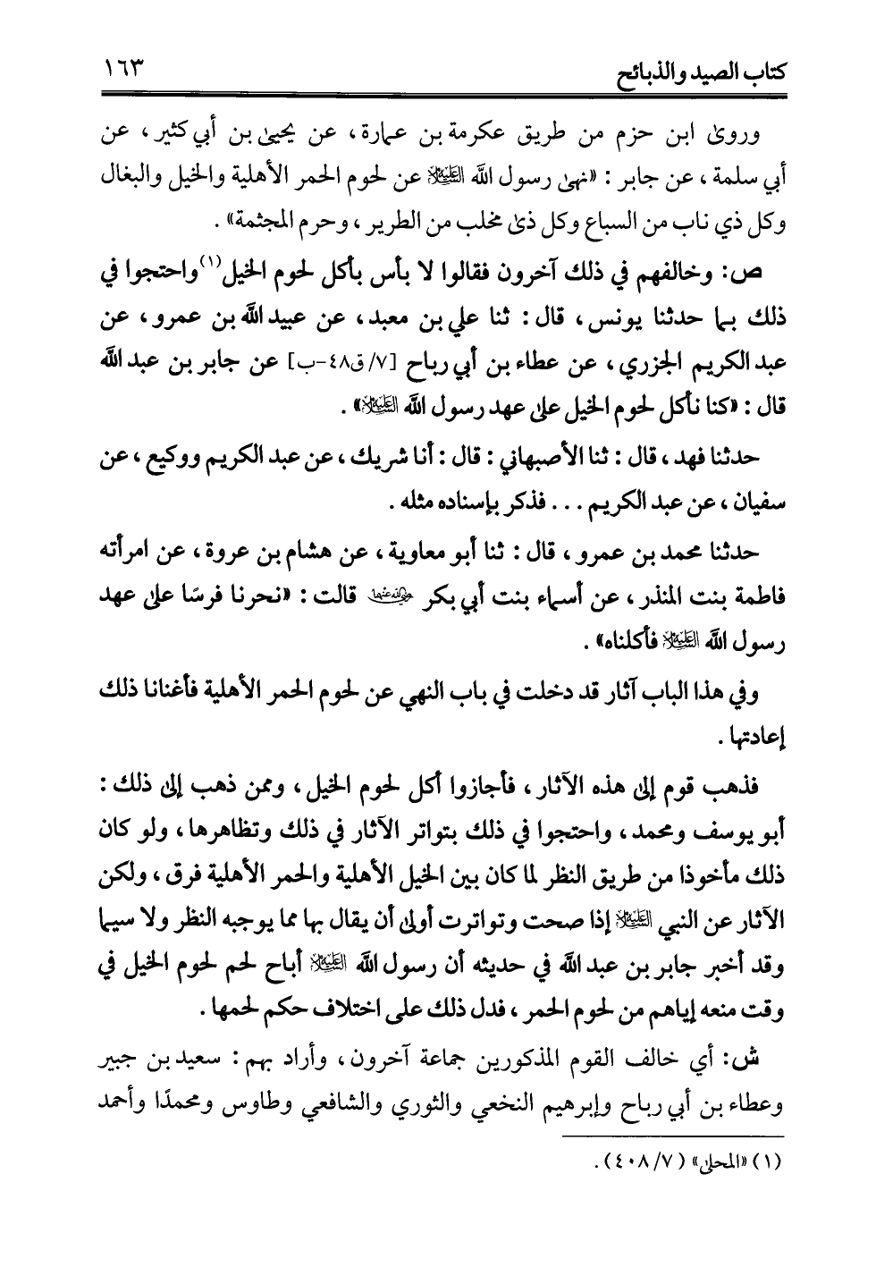 وروى ابن حزم من طريق عكرمة بن عمارة، عن يحيى بن أبي كثير، عن أبي سلمة، عن جابر: "نهى رسول الله -عليه السلام- عن لحوم الحمر الأهلية والخيل والبغال وكل ذي ناب من السباع وكل ذى مخلب من الطير، وحرم المجثمة".
