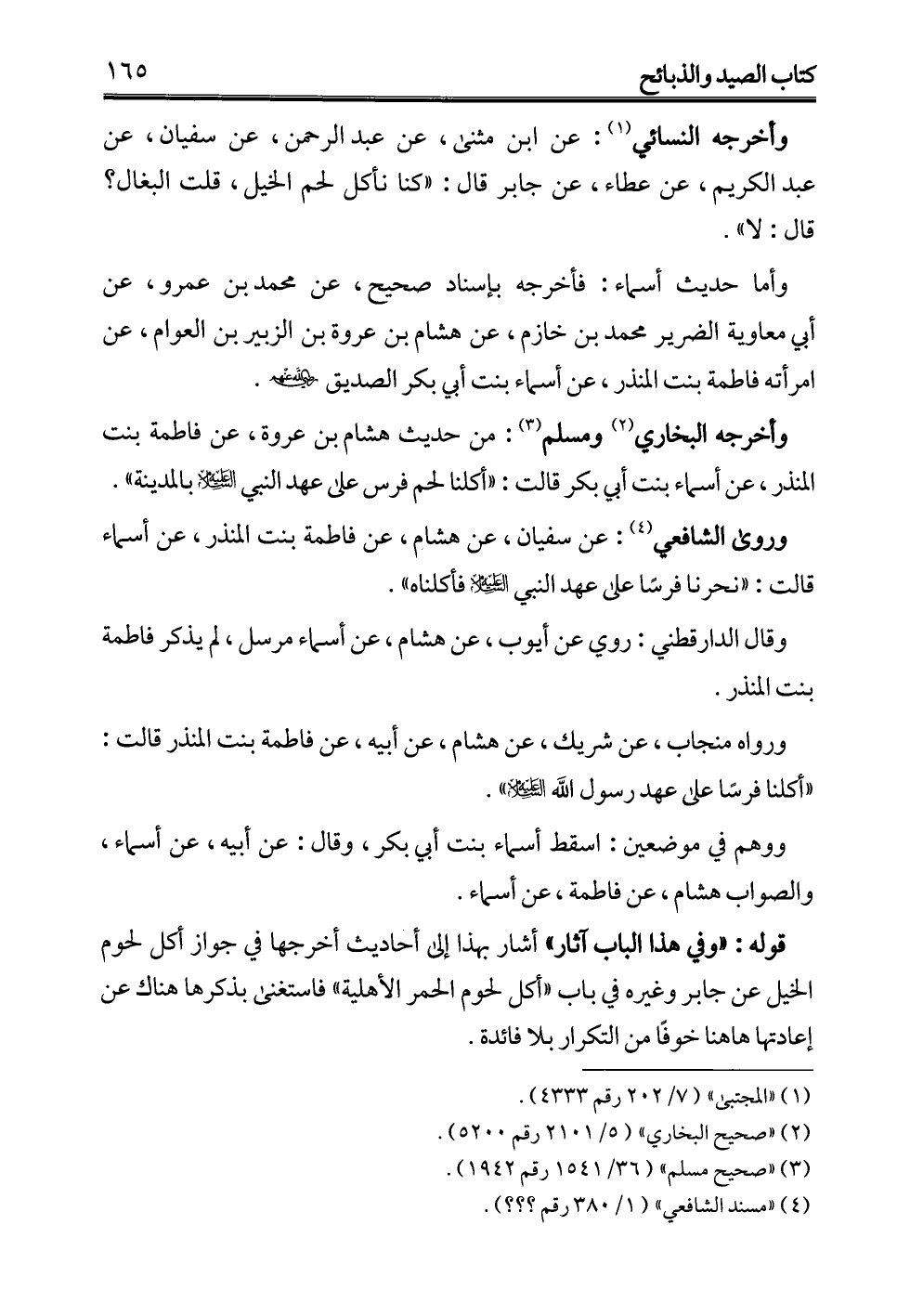 وروى الشافعي (¬4): عن سفيان، عن هشام، عن فاطمة بنت المنذر، عن أسماء قالت: "نحرنا فرسًا على عهد النبي -عليه السلام- فأكلناه".