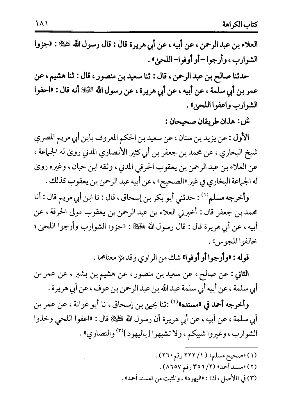 العلاء بن عبد الرحمن، عن أبيه، عن أبي هريرة قال: قال رسول الله -عليه السلام-: "جزوا الشوارب، وأرجوا -أو أوفوا- اللحى".