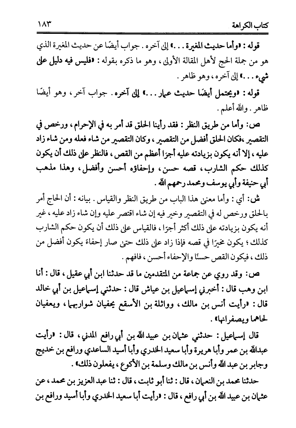 ص: وأما من طريق النظر: فقد رأينا الحلق قد أمر به في الإحرام، ورخص في التقصير، فكان الحلق أفضل من التقصير، وكان التقصير من شاء فعله ومن شاء زاد عليه، إلا أنه يكون بزيادته عليه أجرًا أعظم من القص، فالنظر على ذلك أن يكون كذلك حكم الشارب، قصه حسن، وإحفاؤه أحسن وأفضل، وهذا مذهب أبي حنيفة وأبي يوسف ومحمد -رحمهم الله-.