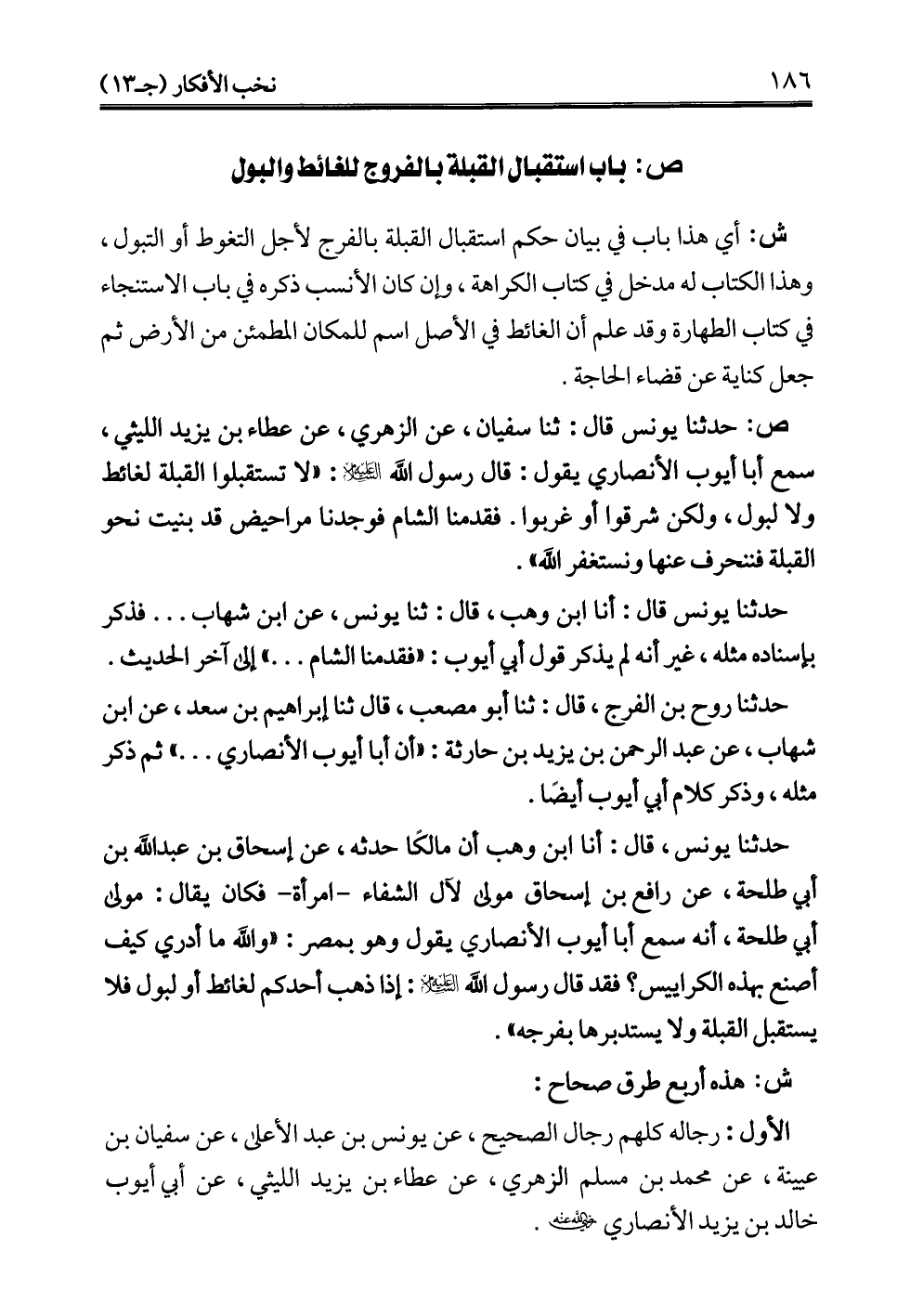 ص: حدثنا يونس قال: ثنا سفيان، عن الزهري، عن عطاء بن يزيد الليثي، سمع أبا أيوب الأنصاري يقول: قال رسول الله -عليه السلام-: "لا تستقبلوا القبلة لغائط ولا لبول، ولكن شرقوا أو غربوا. فقدمنا الشام فوجدنا مراحيض قد بنيت نحو القبلة فننحرف عنها ونستغفر الله".
