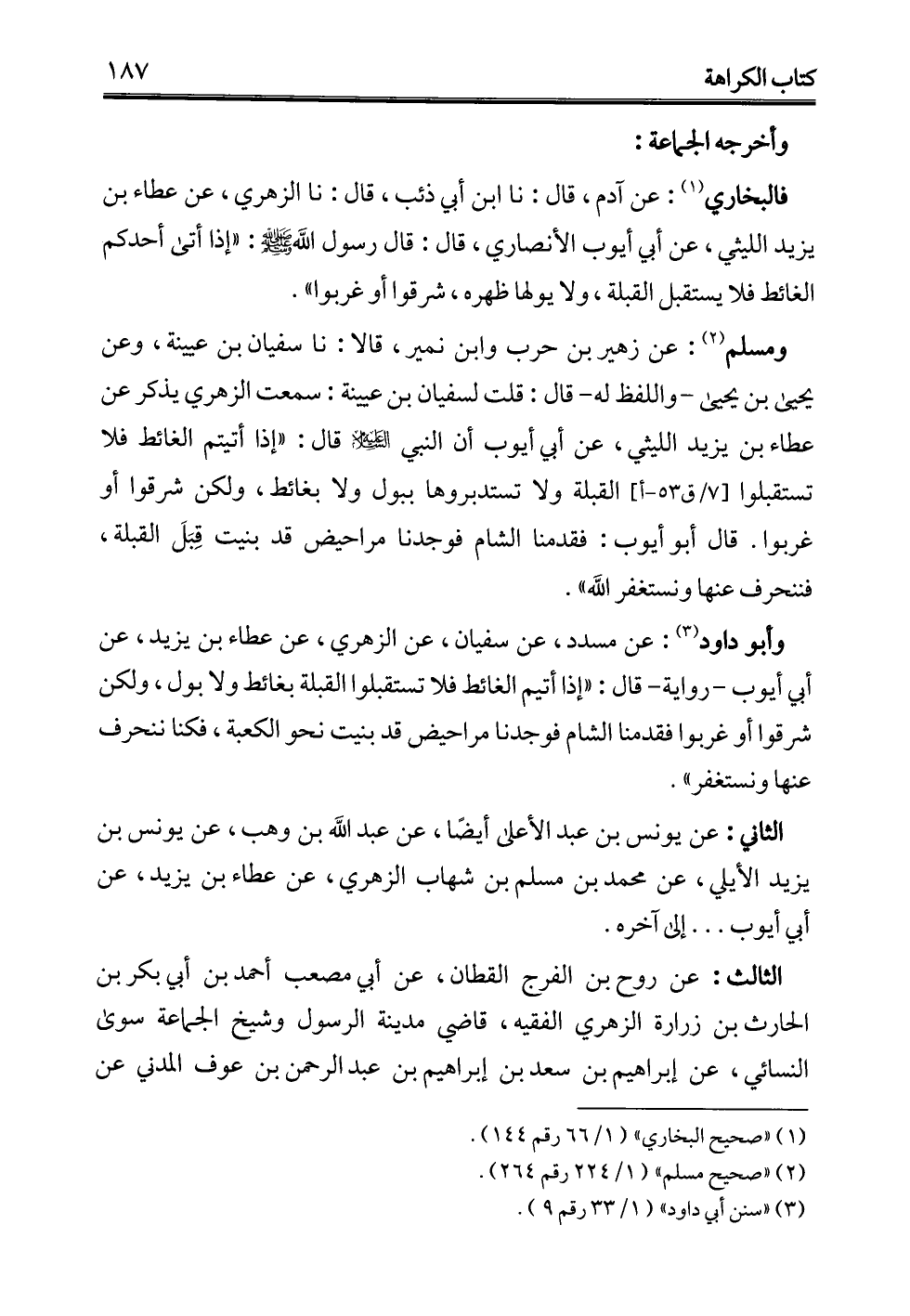 وأبو داود (¬3): عن مسدد، عن سفيان، عن الزهري، عن عطاء بن يزيد، عن أبي أيوب -رواية- قال: "إذا أتيتم الغائط فلا تستقبلوا القبلة بغائط ولا بول، ولكن شرقوا أو غربوا فقدمنا الشام فوجدنا مراحيض قد بنيت نحو الكعبة، فكنا ننحرف عنها ونستغفر".