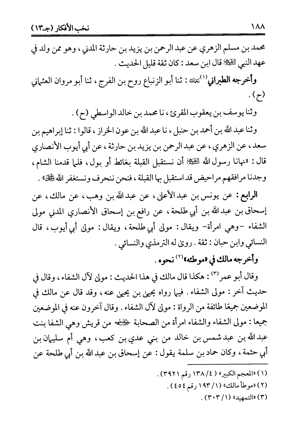 وقال أبو عمر (¬3): هكذا قال مالك في هذا الحديث: مولى لآل الشفاء، وقال في حديث آخر: مولى الشفاء. فيما رواه يحيى بن يحيى عنه، وقد قال عن مالك في الموضعين جميعًا طائفة من الرواة: مولى لآل الشفاء. وقال آخرون عنه في الموضعين جميعًا: مولى الشفاء والشفاء امرأة من الصحابة - رضي الله عنهم - من قريش وهي الشفا بنت عبد الله بن عبد شمس بن خالد من بني عدي بن كعب، وهي أم سليمان بن أبي حثمة، وكان حماد بن سلمة يقول: عن إسحاق بن عبد الله بن أبي طلحة عن
