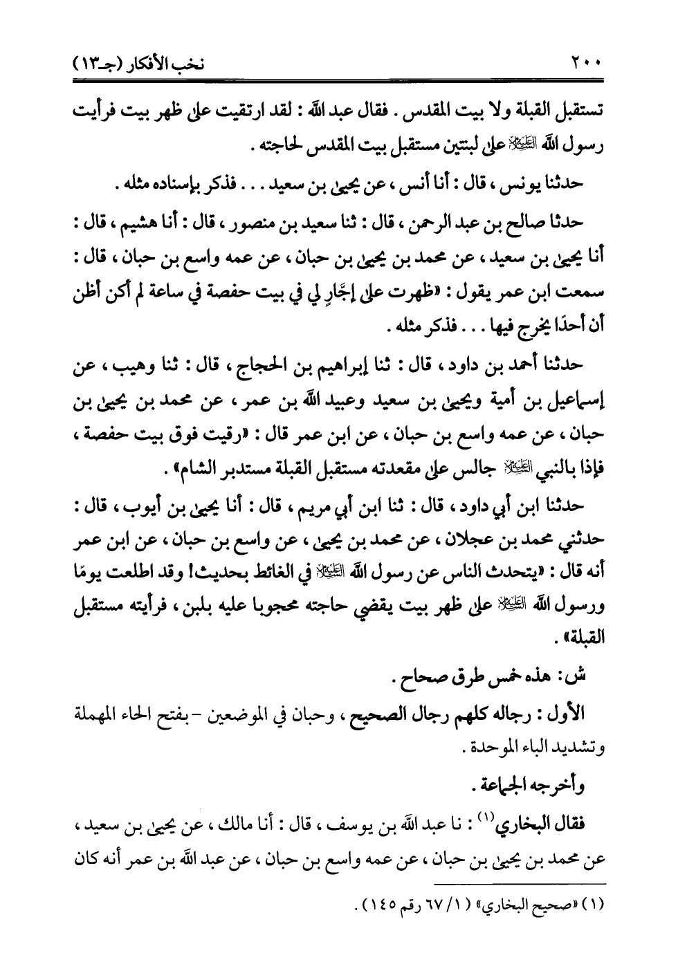 حدثنا أحمد بن داود، قال: ثنا إبراهيم بن الحجاج، قال: ثنا وهيب، عن إسماعيل بن أمية ويحيى بن سعيد وعبيد الله بن عمر، عن محمَّد بن يحيى بن حبان، عن عمه واسع بن حبان، عن ابن عمر قال: "رقيت فوق بيت حفصة، فإذا بالنبي -عليه السلام- جالس على مقعدته مستقبل القبلة مستدبر الشام".