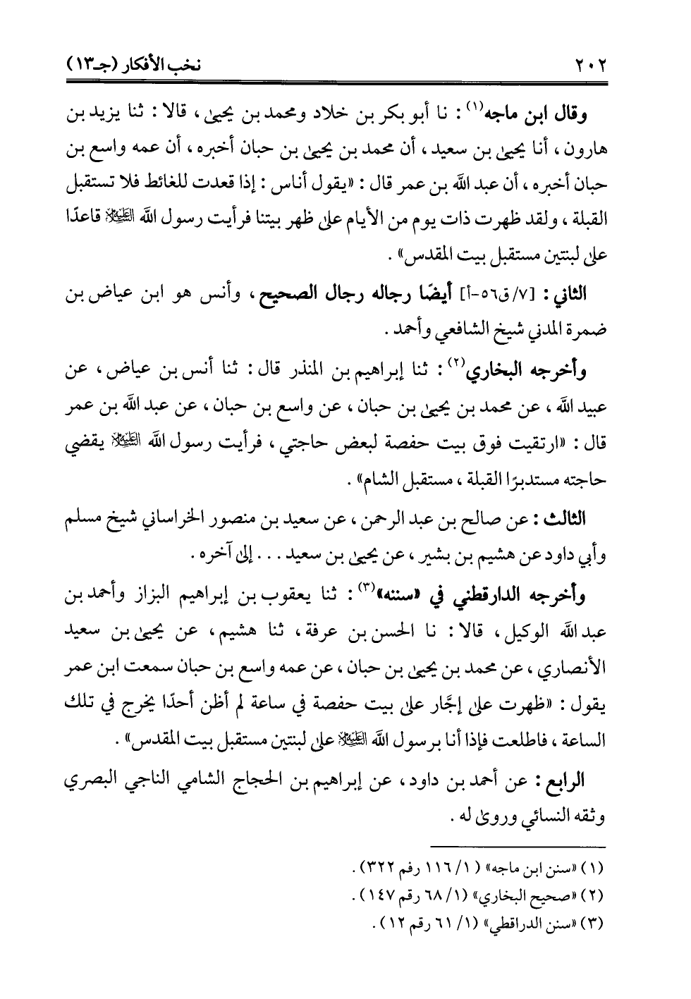 وقال ابن ماجه (¬1): نا أبو بكر بن خلاد ومحمد بن يحيى، قالا: ثنا يزيد بن هارون، أنا يحيى بن سعيد، أن محمَّد بن يحيى بن حبان أخبره، أن عمه واسع بن حبان أخبره، أن عبد الله بن عمر قال: "يقول أناس: إذا قعدت للغائط فلا تستقبل القبلة، ولقد ظهرت ذات يوم من الأيام على ظهر بيتنا فرأيت رسول الله -عليه السلام- قاعدًا على لبنتين مستقبل بيت المقدس".