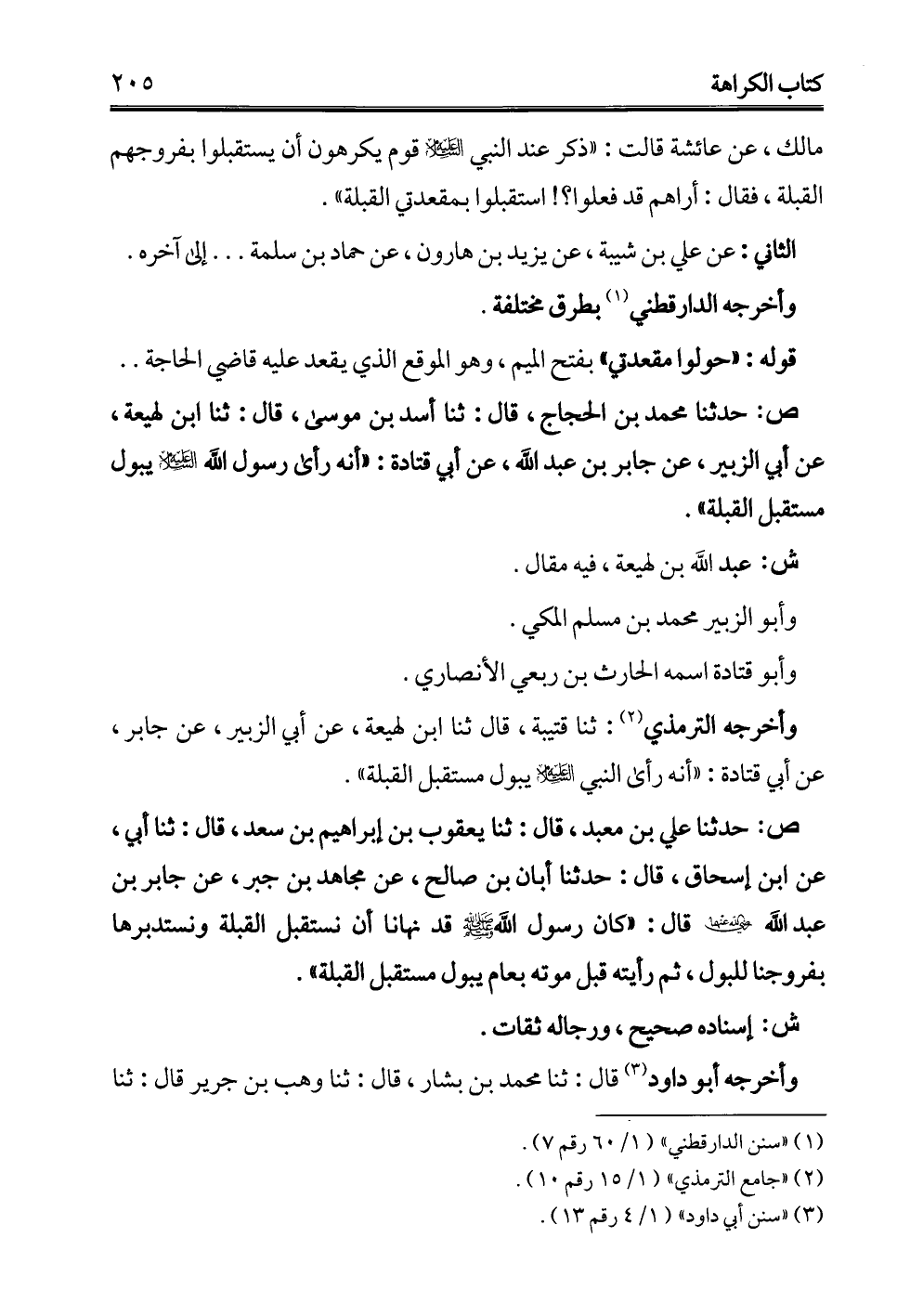 وأخرجه الترمذي (¬2): ثنا قتيبة، قال ثنا ابن لهيعة، عن أبي الزبير، عن جابر، عن أبي قتادة: "أنه رأى النبي -عليه السلام- يبول مستقبل القبلة".