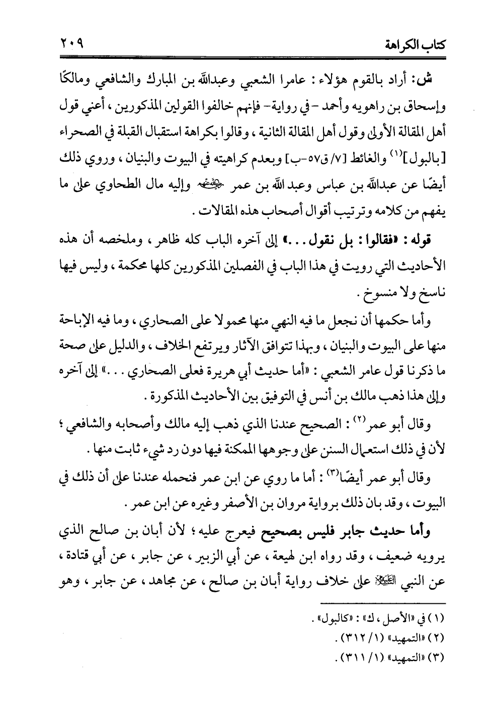 وأما حكمها أن نجعل ما فيه النهي منها محمولا على الصحاري، وما فيه الإباحة منها على البيوت والبنيان، وبهذا تتوافق الآثار ويرتفع الخلاف، والدليل على صحة ما ذكرنا قول عامر الشعبي: "أما حديث أبي هريرة فعلى الصحاري. . . ." إلى آخره وإلى هذا ذهب مالك بن أنس في التوفيق بين الأحاديث المذكورة.