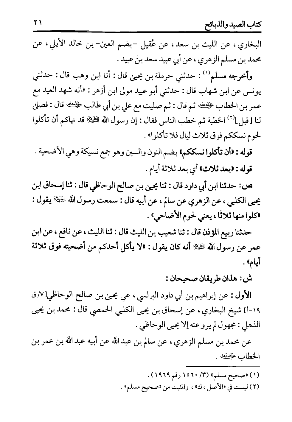 وأخرجه مسلم (¬1): حدثني حرملة بن يحيى قال: أنا ابن وهب قال: حدثني يونس عن ابن شهاب قال: حدثني أبو عبيد مولى ابن أزهر: "أنه شهد العيد مع عمر بن الخطاب -رضي الله عنه- ثم قال: ثم صليت مع علي بن أبي طالب -رضي الله عنه- قال: فصلى لنا [قبل] (¬2) الخطبة ثم خطب الناس فقال: إن رسول الله -عليه السلام- قد نهاكم أن تأكلوا لحوم نسككم فوق ثلاث ليال فلا تأكلوا".