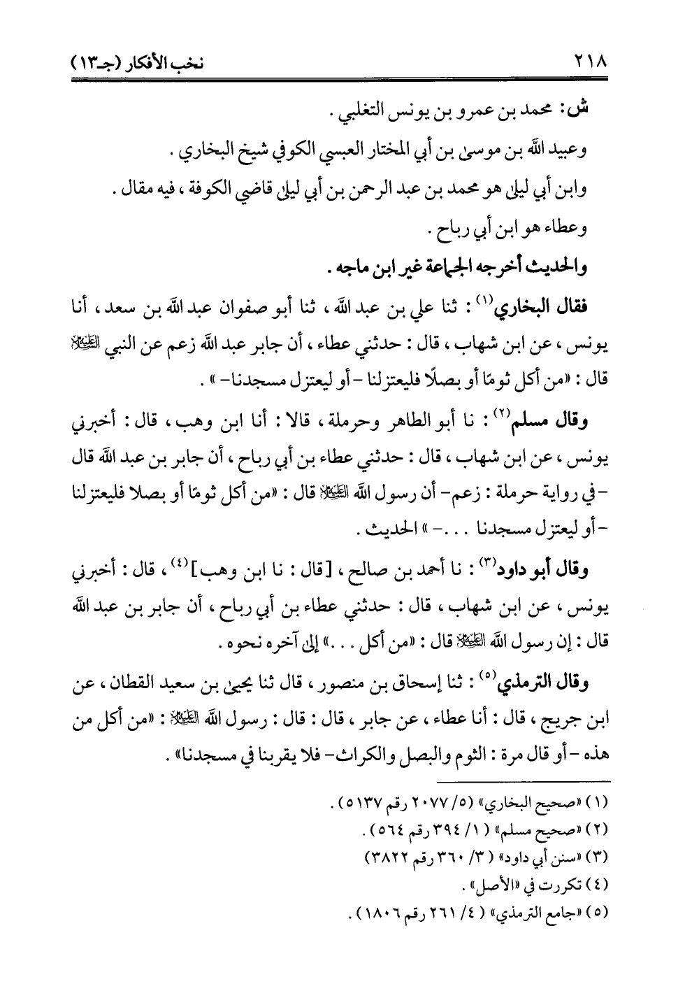 فقال البخاري (¬1): ثنا علي بن عبد الله، ثنا أبو صفوان عبد الله بن سعد، أنا يونس، عن ابن شهاب، قال: حدثني عطاء، أن جابر عبد الله زعم عن النبي -عليه السلام- قال: "من أكل ثومًا أو بصلًا فليعتزلنا -أو ليعتزل مسجدنا-".