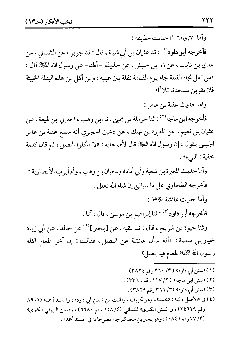 فأخرجه أبو داود (¬1): ثنا عثمان بن أبي شيبة، قال: ثنا جرير، عن الشيباني، عن عدي بن ثابت، عن زر بن حبيش، عن حذيفة -أظنه- عن رسول الله -عليه السلام- قال: "من تفل تجاه القبلة جاء يوم القيامة تفلة بين عينيه، ومن أكل من هذه البقلة الخبيثة فلا يقربن مسجدنا ثلاثًا".
