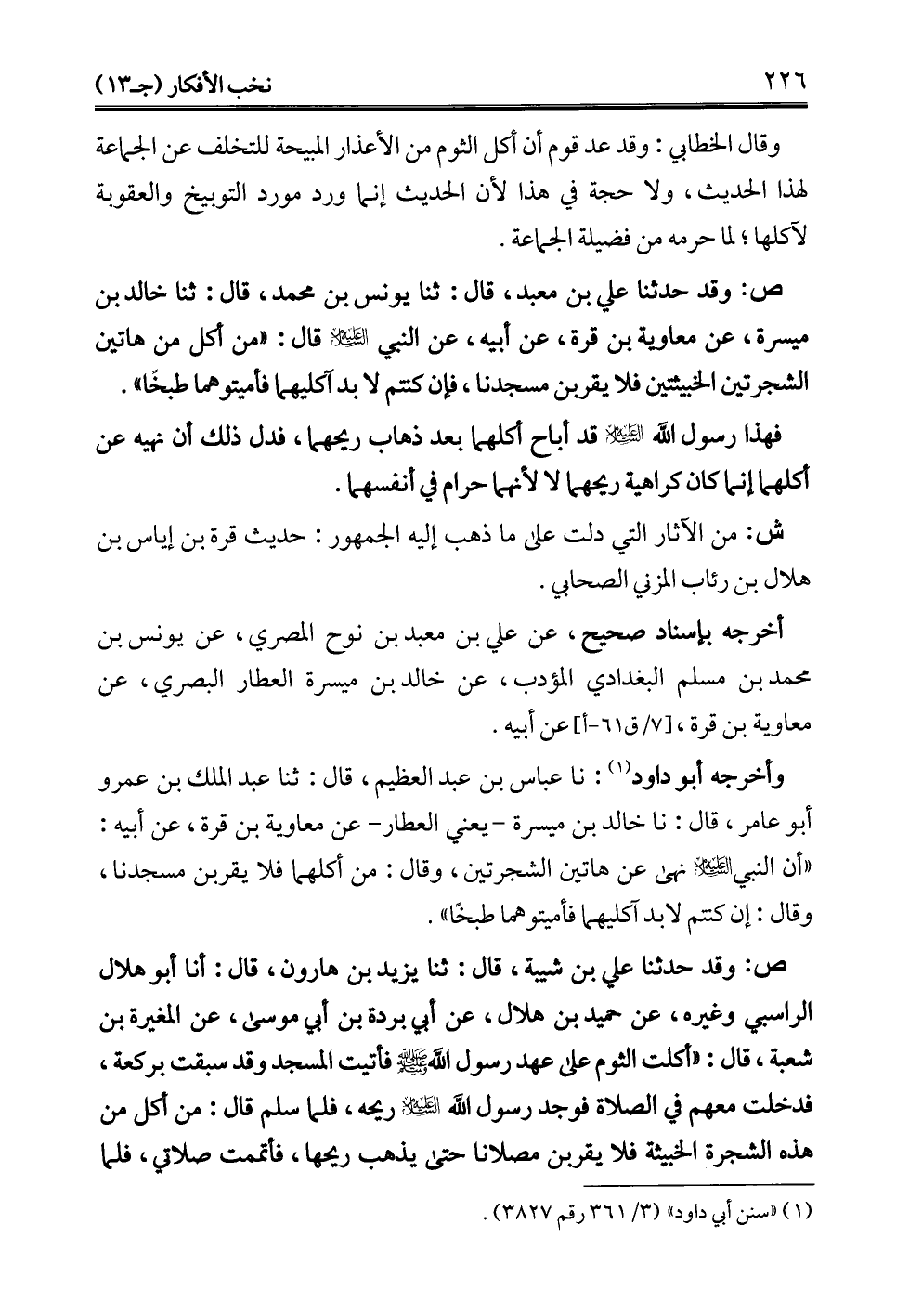 وأخرجه أبو داود (¬1): نا عباس بن عبد العظيم، قال: ثنا عبد الملك بن عمرو أبو عامر، قال: نا خالد بن ميسرة -يعني العطار- عن معاوية بن قرة، عن أبيه: "أن النبي -عليه السلام- نهى عن هاتين الشجرتين، وقال: من أكلهما فلا يقربن مسجدنا، وقال: إن كنتم لابد آكليهما فأميتوهما طبخًا".