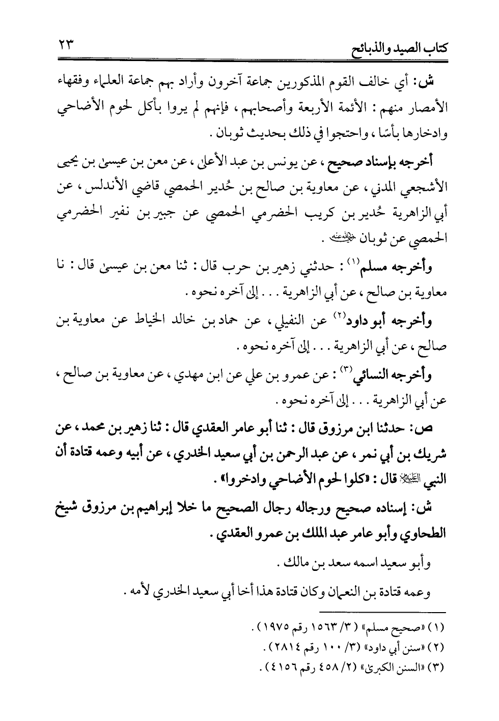 ص: حدثنا ابن مرزوق قال: ثنا أبو عامر العقدي قال: ثنا زهير بن محمد، عن شريك بن أبي نمر، عن عبد الرحمن بن أبي سعيد الخدري، عن أبيه وعمه قتادة أن النبي -عليه السلام- قال: "كلوا لحوم الأضاحي وادخروا".