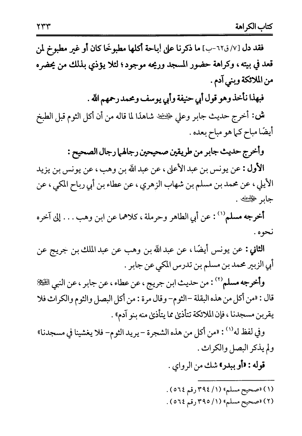 ش: أخرج حديث جابر وعلي - رضي الله عنهما - شاهدًا لما قاله من أن أكل الثوم قبل الطبخ أيضًا مباح كما هو مباح بعده.