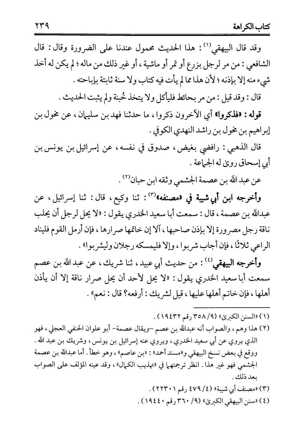 وأخرجه ابن أبي شيبة في "مصنفه" (¬3): ثنا وكيع، قال: ثنا إسرائيل، عن عبد الله بن عصمة، قال: سمعت أبا سعيد الخدري يقول: "لا يحل لرجل أن يحلب ناقة رجل مصرورة إلا بإذن صاحبها، ألا إن خاتمها صرارها، فإن أرمل القوم فليناد الراعي ثلاثًا، فإن أجاب شربوا، وإلا فليمسكه رجلان وليشربوا".