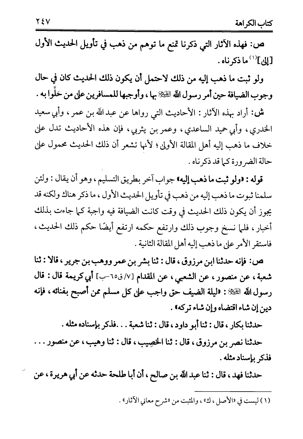 ص: فإنه حدثنا ابن مرزوق، قال: ثنا بشر بن عمر ووهب بن جرير، قالا: ثنا شعبة، عن منصور، عن الشعبي، عن المقدام أبي كريمة قال: قال رسول الله -عليه السلام-: "ليلة الضيف حق واجب على كل مسلم ممن أصبح بفنائه، فإنه دين إن شاء اقتضاه وإن شاء تركه".