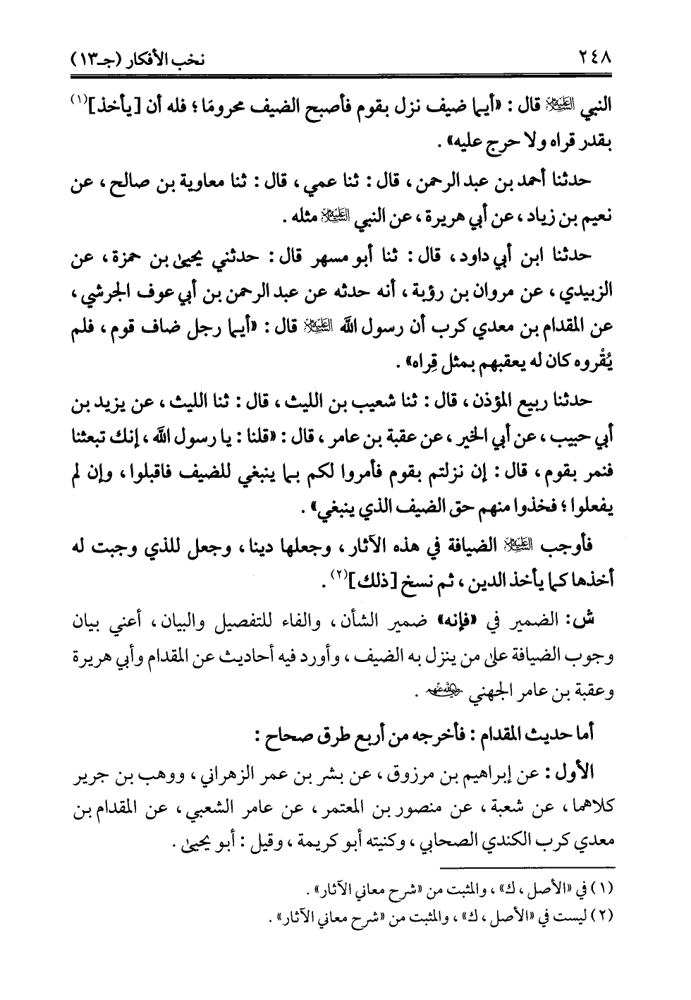 ش: الضمير في "فإنه" ضمير الشأن، والفاء للتفصيل والبيان، أعني بيان وجوب الضيافة على من ينزل به الضيف، وأورد فيه أحاديث عن المقدام وأبي هريرة وعقبة بن عامر الجهني - رضي الله عنهم -.