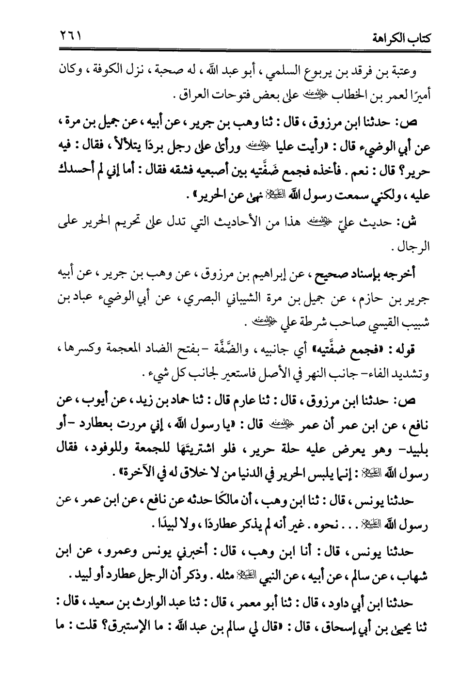 ص: حدثنا ابن مرزوق، قال: ثنا وهب بن جرير، عن أبيه، عن جميل بن مرة، عن أبي الوضيء قال: "رأيت عليًا - رضي الله عنه - ورأى على رجل بردًا يتلألأ، فقال: فيه حرير؟ قال: نعم. فأخذه فجمع ضَفَّتيه بين أصبعيه فشقه فقال: أما إني لم أحسدك عليه، ولكني سمعت رسول الله -عليه السلام- نهى عن الحرير".