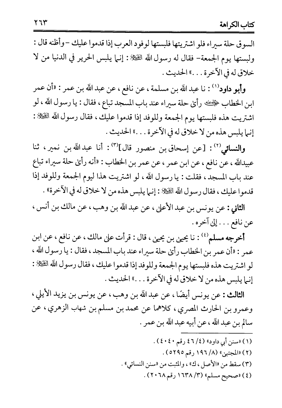 وأبو داود (¬1): نا عبد الله بن مسلمة، عن نافع، عن عبد الله بن عمر: "أن عمر بن الخطاب - رضي الله عنه - رأى حلة سيراء عند باب المسجد تباع، فقال: يا رسول الله، لو اشتريت هذه فلبستها يوم الجمعة وللوفد إذا قدموا عليك، فقال رسول الله -عليه السلام-: إنما يلبس هذه من لا خلاق له في الآخرة. . . ." الحديث.