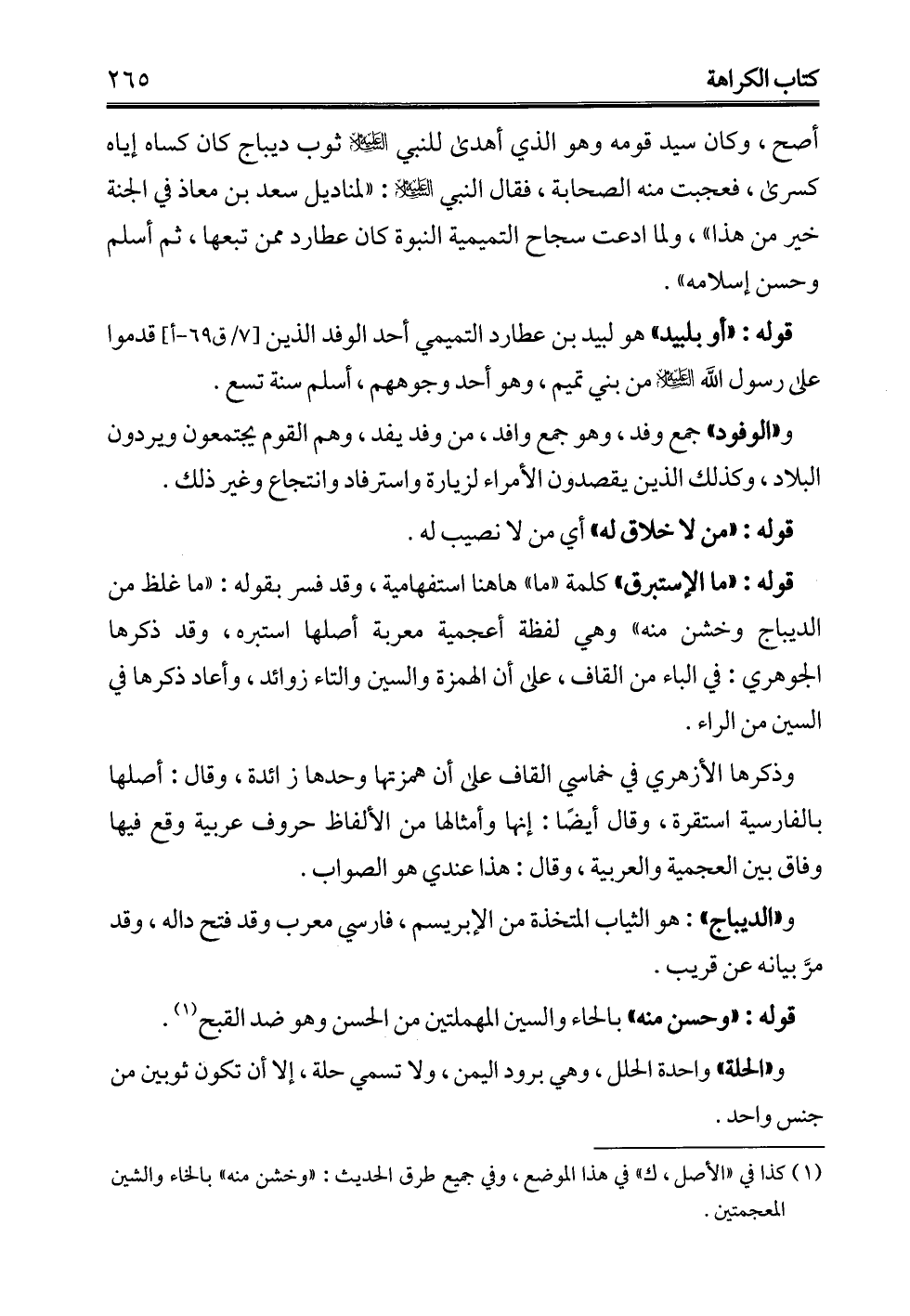 أصح، وكان سيد قومه وهو الذي أهدى للنبي -عليه السلام- ثوب ديباج كان كساه إياه كسرى، فعجبت منه الصحابة، فقال النبي -عليه السلام-: "لمناديل سعد بن معاذ في الجنة خير من هذا"، ولما ادعت سجاح التميمية النبوة كان عطارد ممن تبعها، ثم أسلم وحسن إسلامه".