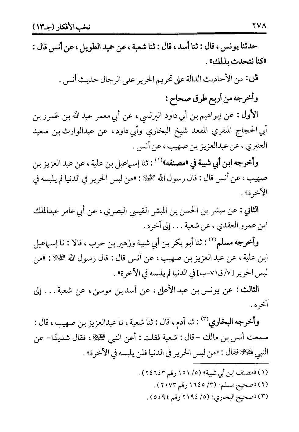 وأخرجه ابن أبي شيبة في "مصنفه" (¬1): ثنا إسماعيل بن علية، عن عبد العزيز بن صهيب، عن أنس قال: قال رسول الله -عليه السلام-: "من لبس الحرير في الدنيا لم يلبسه في الآخرة".