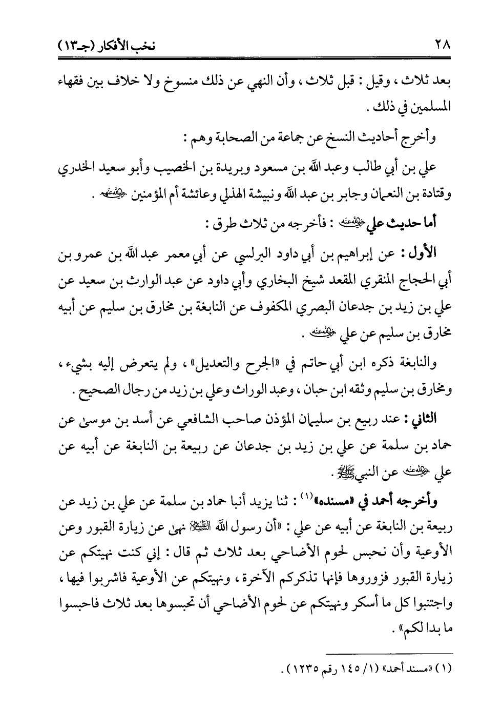 وأخرجه أحمد في "مسنده" (¬1): ثنا يزيد أنبا حماد بن سلمة عن علي بن زيد عن ربيعة بن النابغة عن أبيه عن علي: "أن رسول الله -عليه السلام- نهى عن زيارة القبور وعن الأوعية وأن نحبس لحوم الأضاحي بعد ثلاث ثم قال: إني كنت نهيتكم عن زيارة القبور فزوروها فإنها تذكركم الآخرة، ونهيتكم عن الأوعية فاشربوا فيها، واجتنبوا كل ما أسكر ونهيتكم عن لحوم الأضاحي أن تحبسوها بعد ثلاث فاحبسوا ما بدا لكم".