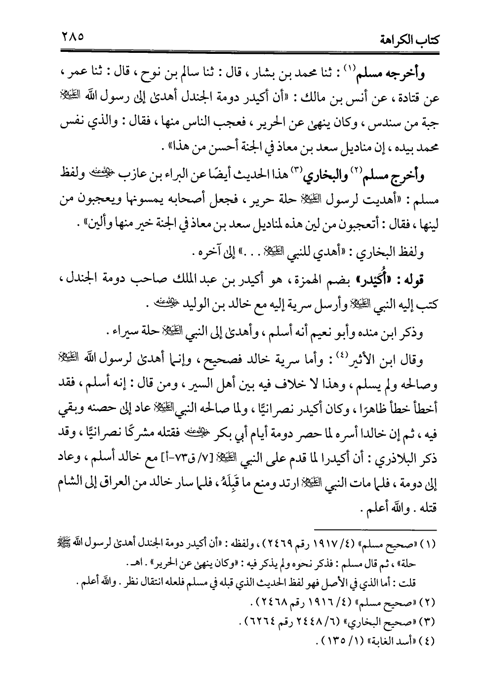 (¬1) "صحيح مسلم" (4/ 1917 رقم 2469)، ولفظه: "أن أكيدر دومة الجندل أهدى لرسول الله - صلى الله عليه وسلم - حلة"، ثم قال مسلم: فذكر نحوه ولم يذكر فيه: "وكان ينهى عن الحرير". اهـ.