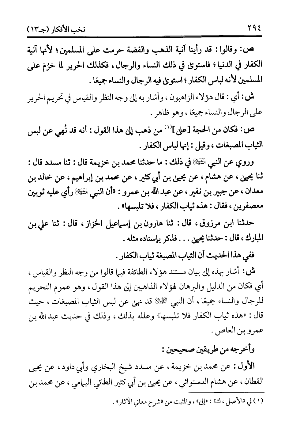 وروي عن النبي -عليه السلام- في ذلك: ما حدثنا محمد بن خزيمة قال: ثنا مسدد قال: ثنا يحيى، عن هشام، عن يحيى بن أبي كثير، عن محمد بن إبراهيم، عن خالد بن معدان، عن جبير بن نفير، عن عبد الله بن عمرو: "أن النبي -عليه السلام- رأي عليه ثوبين معصفرين، فقال: هذه ثياب الكفار، فلا تلبسها".