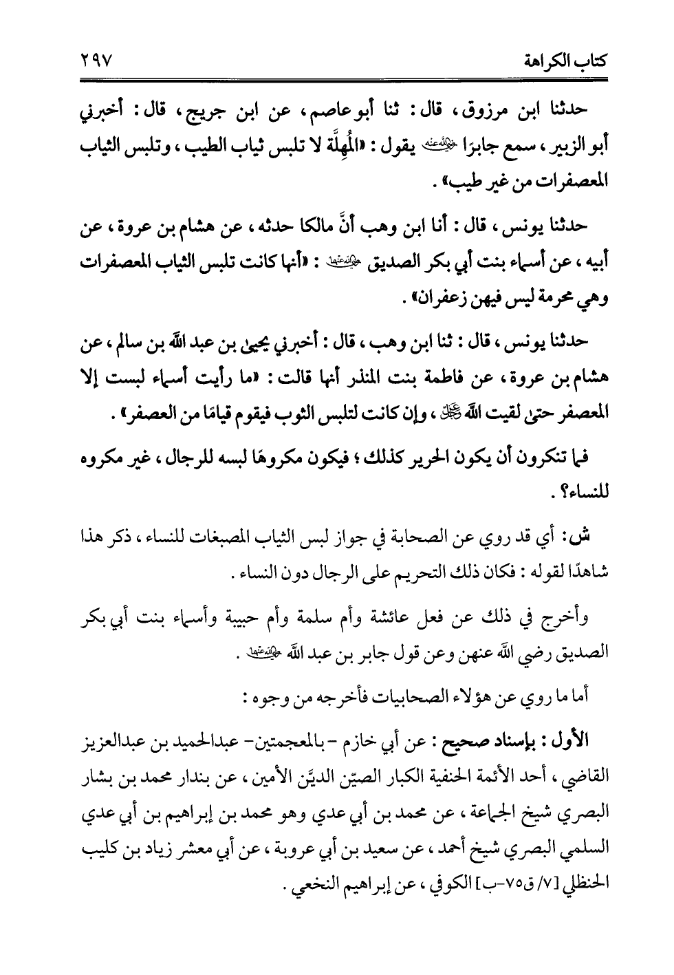 حدثنا يونس، قال: أنا ابن وهب أنَّ مالكا حدثه، عن هشام بن عروة، عن أبيه، عن أسماء بنت أبي بكر الصديق - رضي الله عنها -: "أنها كانت تلبس الثياب المعصفرات وهي محرمة ليس فيهن زعفران".