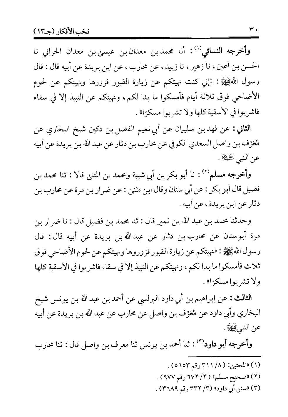 وحدثنا محمد بن عبد الله بن نمير قال: ثنا محمد بن فضيل قال: نا ضرار بن مرة أبو سنان عن محارب بن دثار عن عبد الله بن بريدة عن أبيه قال: قال رسول الله - صلى الله عليه وسلم -: "نهيتكم عن زيارة القبور فزوروها ونهيتكم عن لحوم الأضاحي فوق ثلاث فأمسكوا ما بدا لكم، ونهيتكم عن النبيذ إلا في سقاء فاشربوا في الأسقية كلها ولا تشربوا مسكرًا".