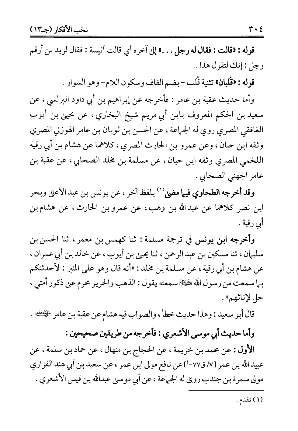قال أبو سعيد: وهذا حديث خطأ، والصواب فيه هشام عن عقبة بن عامر - رضي الله عنه -.