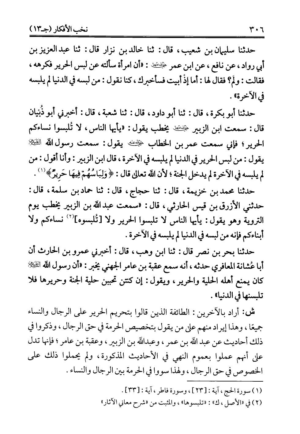 حدثنا بحر بن نصر قال: ثنا ابن وهب، قال: أخبرني عمرو بن الحارث أن أبا عُشانة المعافري حدثه، أنه سمع عقبة بن عامر الجهني يخبر: "أن رسول الله -عليه السلام- كان يمنع أهله الحلية والحرير، ويقول: إن كنتن تحببن حلية الجنة وحريرها فلا تلبسنها في الدنيا".