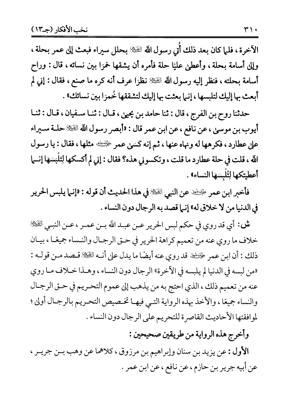 ش: أي قد روي في حكم لبس الحرير عن عبد الله بن عمر، عن النبي -عليه السلام- خلاف ما روي عنه من تعميم كراهة الحرير في حق الرجال والنساء جميعًا، بيان ذلك: أن ابن عمر - رضي الله عنهما - قد روي عنه أيضًا ما يدل على أنه -عليه السلام- قصد من قوله: "من لبسه في الدنيا لم يلبسه في الآخرة" الرجال دون النساء، وهذا خلاف ما روي عنه من تعميم ذلك، الذي احتج به من يذهب إلى عموم التحريم في حق الرجال والنساء جميعًا، والأخذ بهذه الرواية التي فيها تخصيص التحريم بالرجال أولى؛ لموافقتها الأحاديث القاصرة للتحريم على الرجال دون النساء.