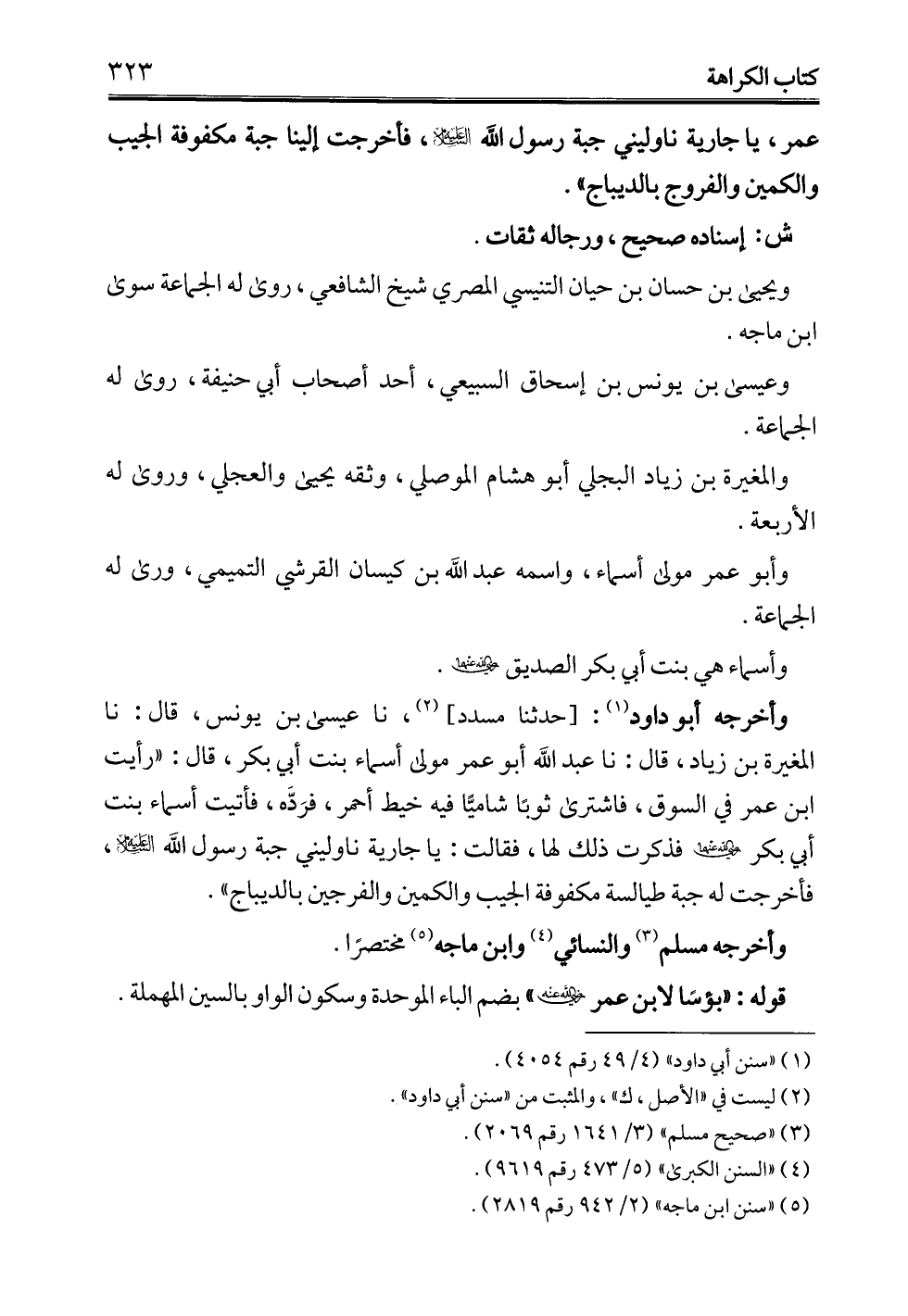 وأخرجه أبو داود (¬1): [حدثنا مسدد] (¬2)، نا عيسى بن يونس، قال: نا المغيرة بن زياد، قال: نا عبد الله أبو عمر مولى أسماء بنت أبي بكر، قال: "رأيت ابن عمر في السوق، فاشترى ثوبًا شاميًّا فيه خيط أحمر، فرَدَّه، فأتيت أسماء بنت أبي بكر - رضي الله عنهما - فذكرت ذلك لها، فقالت: يا جارية ناوليني جبة رسول الله -عليه السلام-، فأخرجت له جبة طيالسة مكفوفة الجيب والكمين والفرجين بالديباج".