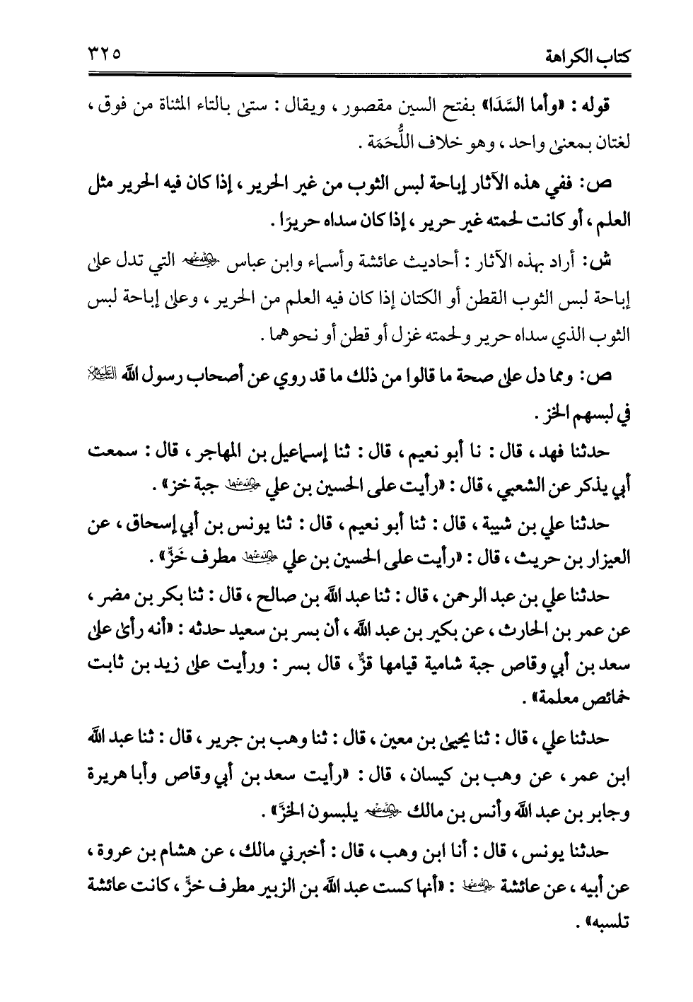 حدثنا علي، قال: ثنا يحيى بن معين، قال: ثنا وهب بن جرير، قال: ثنا عبد الله ابن عمر، عن وهب بن كيسان، قال: "رأيت سعد بن أبي وقاص وأبا هريرة وجابر بن عبد الله وأنس بن مالك - رضي الله عنهم - يلبسون الخزَّ".