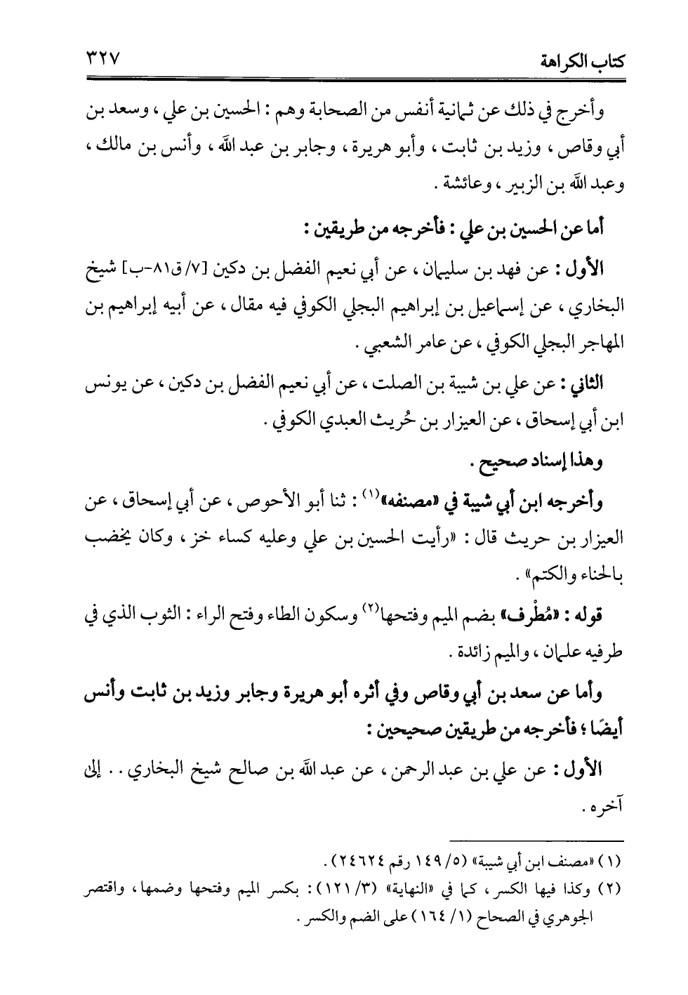 وأخرجه ابن أبي شيبة في "مصنفه" (¬1): ثنا أبو الأحوص، عن أبي إسحاق، عن العيزار بن حريث قال: "رأيت الحسين بن علي وعليه كساء خز، وكان يخضب بالحناء والكتم".