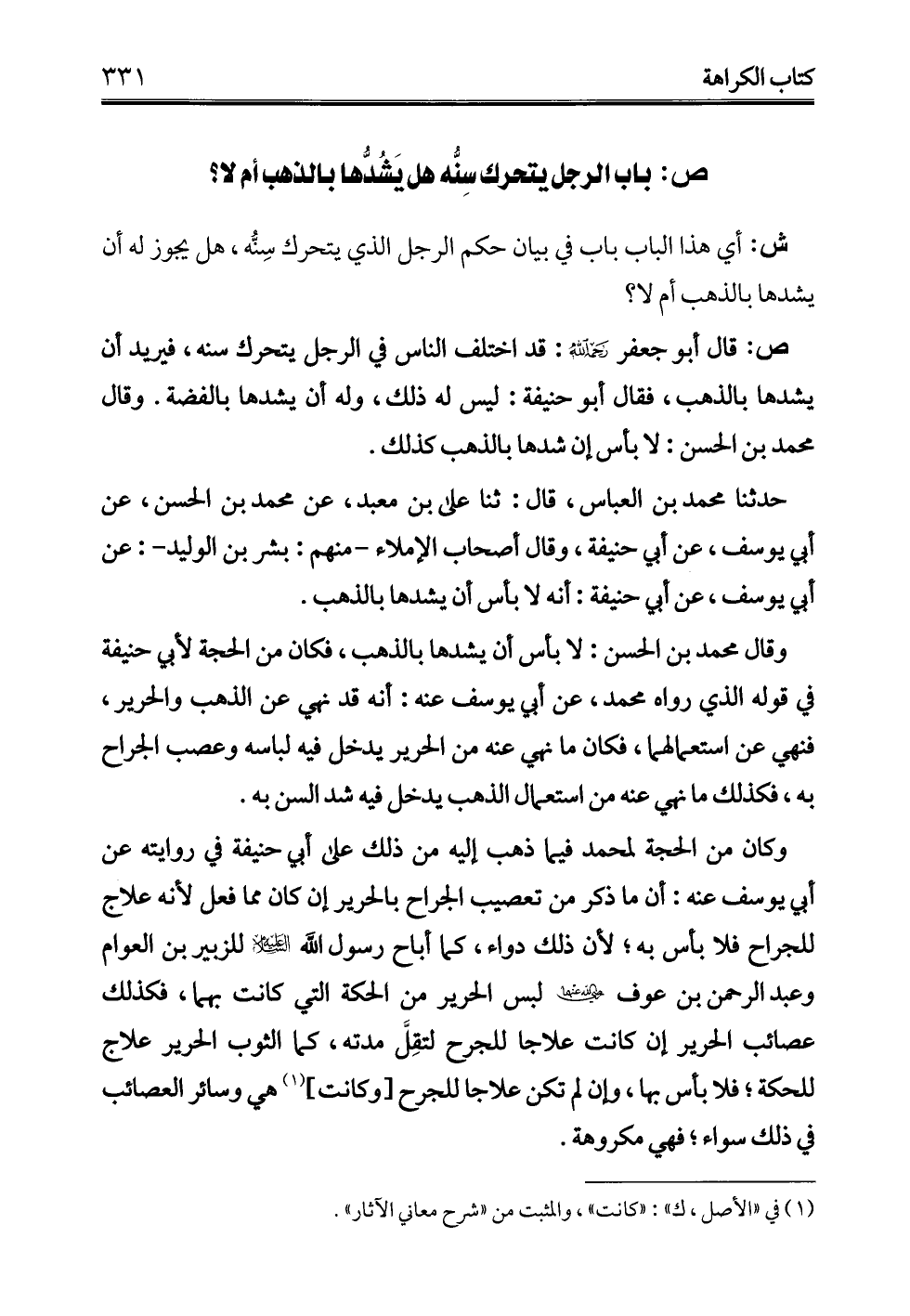 حدثنا محمد بن العباس، قال: ثنا على بن معبد، عن محمد بن الحسن، عن أبي يوسف، عن أبي حنيفة، وقال أصحاب الإملاء -منهم: بشر بن الوليد-: عن أبي يوسف، عن أبي حنيفة: أنه لا بأس أن يشدها بالذهب.
