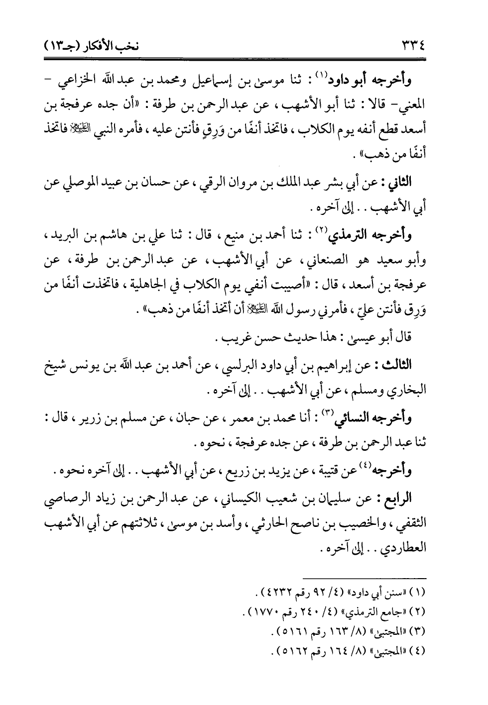 وأخرجه الترمذي (¬2): ثنا أحمد بن منيع، قال: ثنا علي بن هاشم بن البريد، وأبو سعيد هو الصنعاني، عن أبي الأشهب، عن عبد الرحمن بن طرفة، عن عرفجة بن أسعد، قال: "أصيبت أنفي يوم الكلاب في الجاهلية، فاتخذت أنفًا من وَرِق فأنتن عليّ، فأمرني رسول الله -عليه السلام- أن أتخذ أنفًا من ذهب".